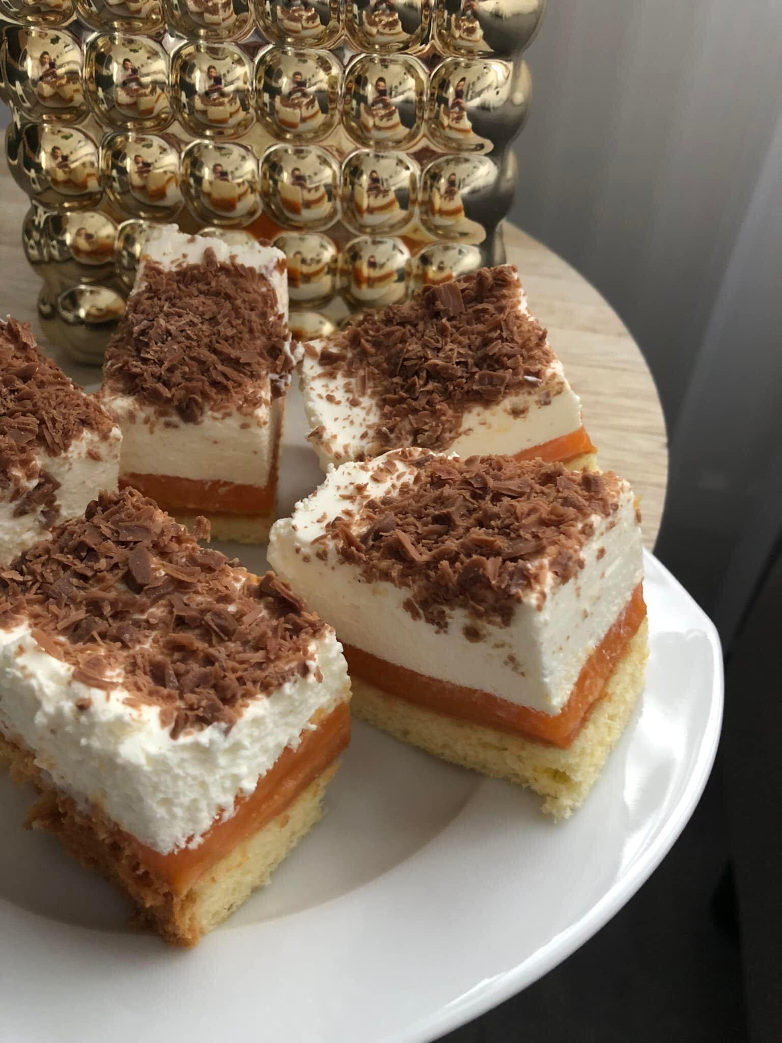 Przepis na delikatne, biszkoptowe ciasto z masą budyniową przygotowaną na soku „Kubuś”, pokrytą bitą śmietaną i startą na tarce mleczną czekoladą.
