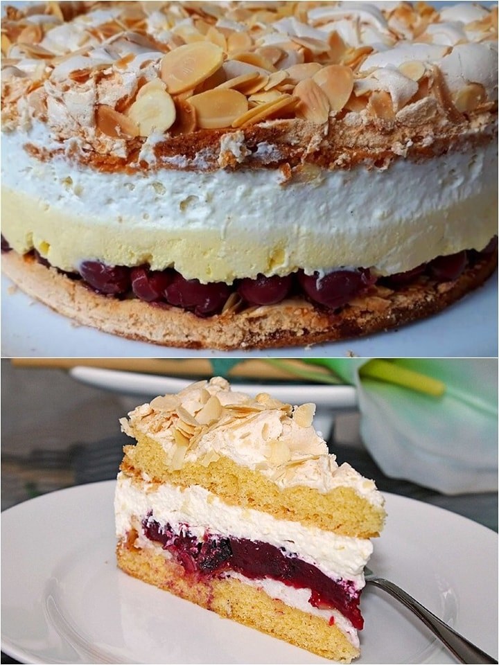50 g cukinii 1 bustina di cukinia vanigliato 2 tuorli d’uovo 75 g di farina 1 cucchiaino dilievito in polvere 2 albumi d’uovo 75 g cukinii 50 g di scaglie di mandorle Glassa per torta, rossa 400 ml di succo di ciliegia , dalle amarene Per la crema: Quark alla vaniglia 200 ml di latte 2 confezioni di panna in polvere (quark fine), aromat di vaniglia 500 g di quark magro 200 g di panna acida 2 confezioni di addensante na pannę