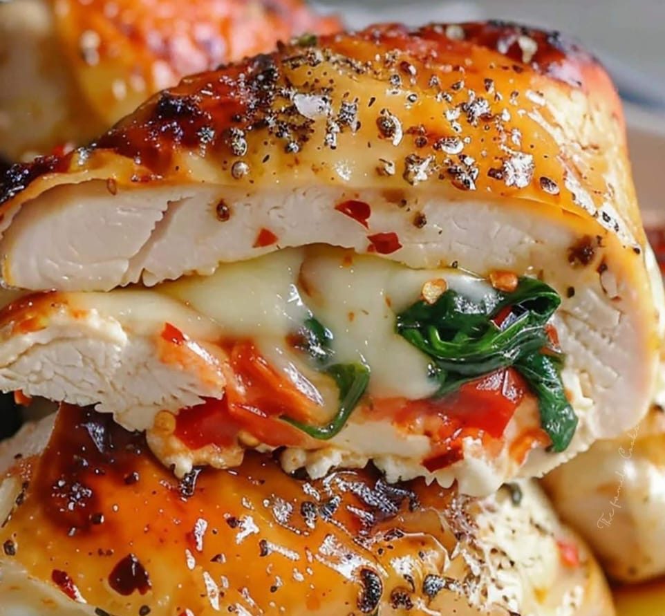Oto przepis na kurczaka faszerowanego pieczoną czerwoną papryką, szpinakiem i mozzarellą: