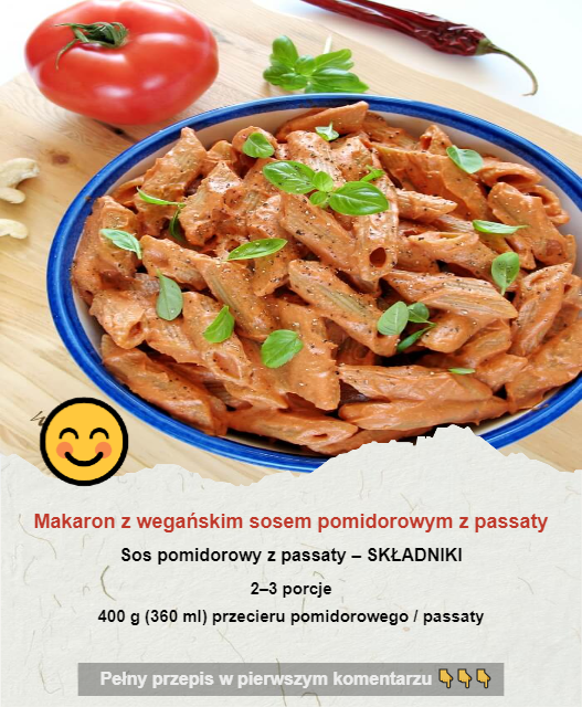 Przepyszny, gęsty i kremowy sos pomidorowy, który smakuje jakby zawierał śmietanę kremówkę, ale w mojej wersji zabieliłam go sto razy zdrowszymi nerkowcami. Ten błyskawiczny i banalny przepis (wystarczy tylko zblendować) dedykuję D., który pół roku temu kupił sobie blender, a jeszcze ani razu go nie użył… Makaron z wegańskim sosem pomidorowym z passaty to najlepszy pretekst, by wreszcie odkurzyć i odpalić sprzęt, bo to danie dla iście początkujących.