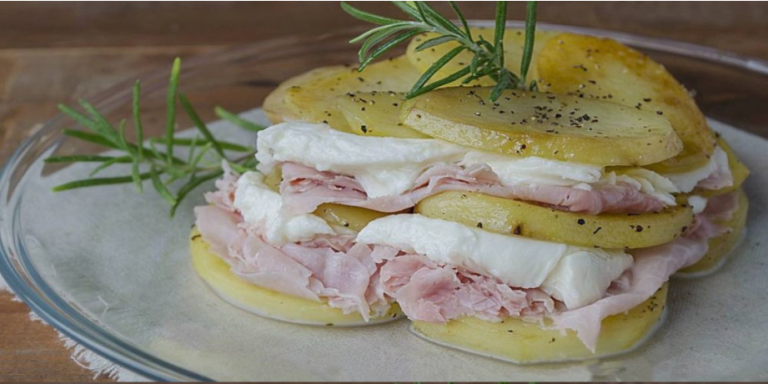 Millefeuille z ziemniakami, szynką i mozzarellą doskonale nadaje się na aperitif lub na rodzinny obiad. Przepis jest bardzo prosty.