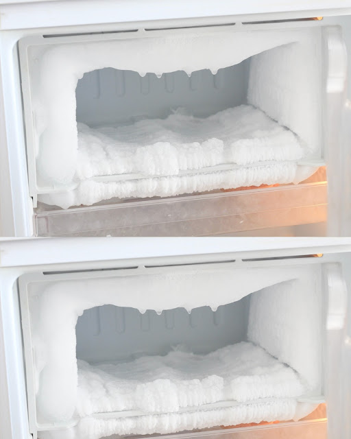 Otwórz drzwi lodówki i zamrażarki i poczekaj, aż temperatura pokojowa zapoczątkuje topnienie. Aby proces przebiegał szybciej, należy umieścić w nim garnek z gorącą wodą i pamiętać o jego regularnej wymianie, gdy ostygnie.