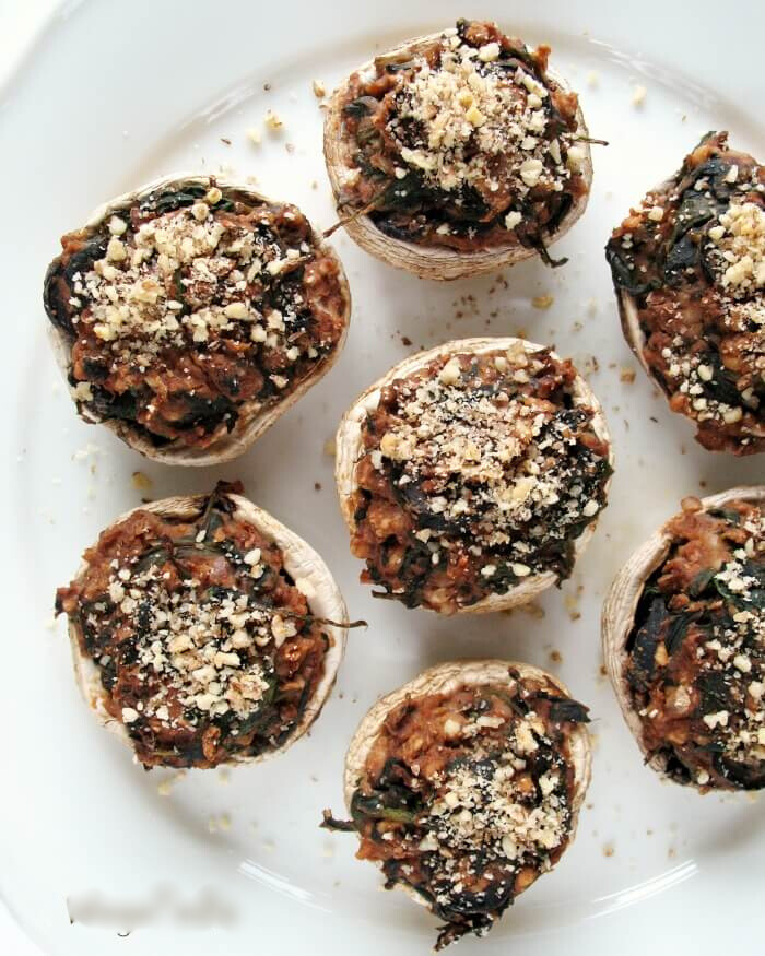 Smakowite, aromatyczne pieczarki faszerowane szpinakiem, fasolą, orzechami włoskimi i oliwkami. Wegetariańskie / wegańskie, dietetyczne i bardzo apetyczne! Do tego dania polecam upolować duże kapelusze, bo one lepiej się prezentują, a faszerowanie przebiega szybciej. Trzonki grzybów można spożytkować robiąc np. sos pieczarkowy. Grzybowe piękności najczęściej serwuję z dobrym pieczywem pełnoziarnistym.