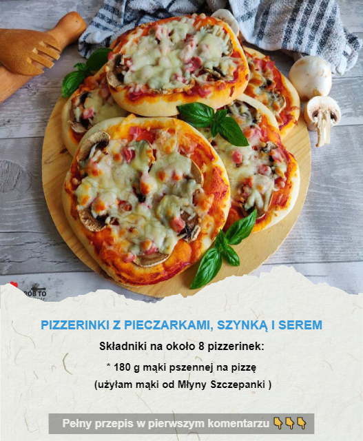 Pizzerinki czyli inaczej pizza w wersji mini. Doskonałe do zabrania je ze sobą do szkoły, pracy czy też na jesienny spacerek. Jako farsz można tu położyć absolutnie wszystko co tylko kto lubi. Moja dzisiejsza propozycja jest bardzo prosta, sos pomidorowy, pieczarki, szynka i ser. Zarówno córce jak i mężowi tak bardzo smakowały, że jeszcze tego samego dnia musiałam upiec kolejne 🙂 Takie pizzerinki to również idealna przekąska imprezowa, są smaczne zarówno na ciepło jak i na zimno 🙂