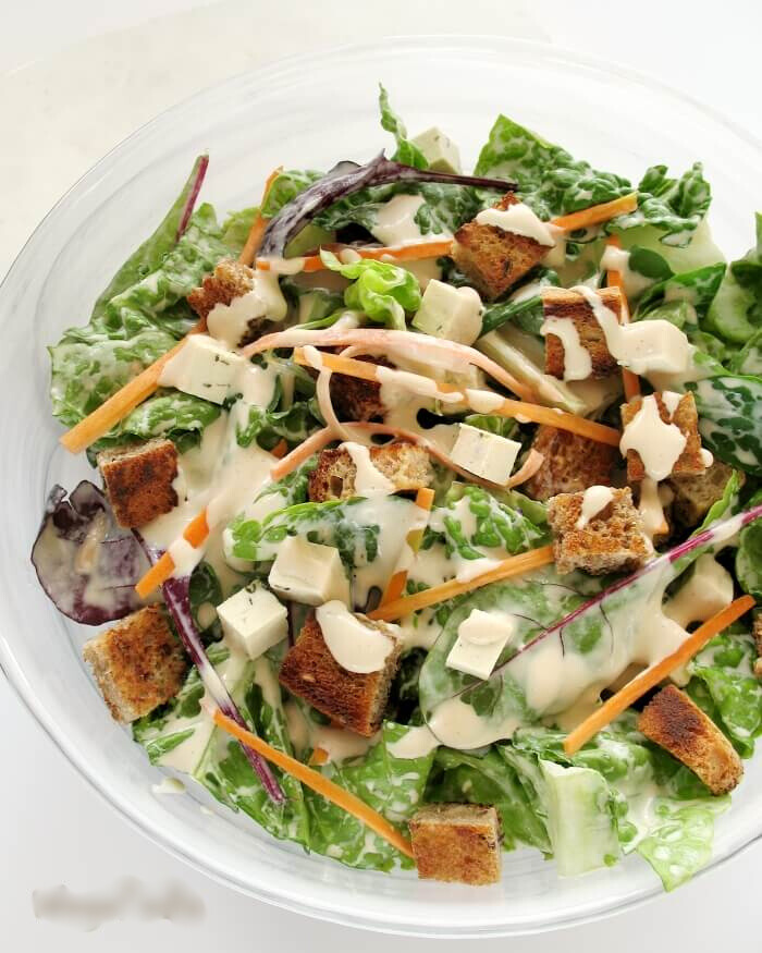 Kiedy byłam jeszcze wszystko-jak-leci-żerna uwieeelbiałam sałatkę cezar z KFC, ale po przejściu na jasną stronę mocy musiałam o niej na dłuższy czas zapomnieć. Ostatnio znów nawiedziła mnie na nią ochota, więc skonstruowałam wegański, dietetyczny sos cezar, a kurczaka w tłustej panierce wymieniłam na lekkie tofu i wyszła sałatka o smaku, od którego długo byłam uzależniona.