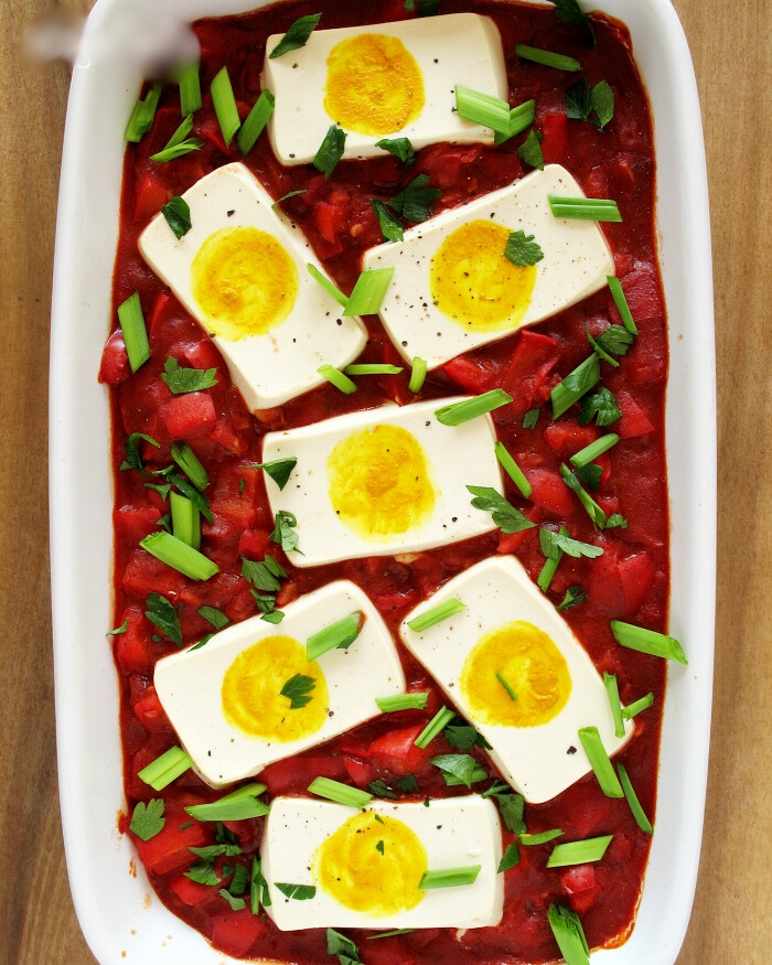 Szakszuka to pyszna propozycja na wykwintne śniadanie rodem z Bliskiego Wschodu. Moja łatwa, wegańska wersja zamiast jajek zawiera silken tofu (soft), które teksturą bardzo przypomina białko ugotowanego jaja. Z kolei intensywnie jajecznego aromatu dostarcza niezawodna czarna sól, czyli kala namak. Dla dodatkowego podkręcenia wrażeń szakszukę można podać z awokado, które w połączeniu w czarną solą smakuje niesamowicie jajecznie. Danie będzie kusząco prezentowało się na wielkanocnym stole.